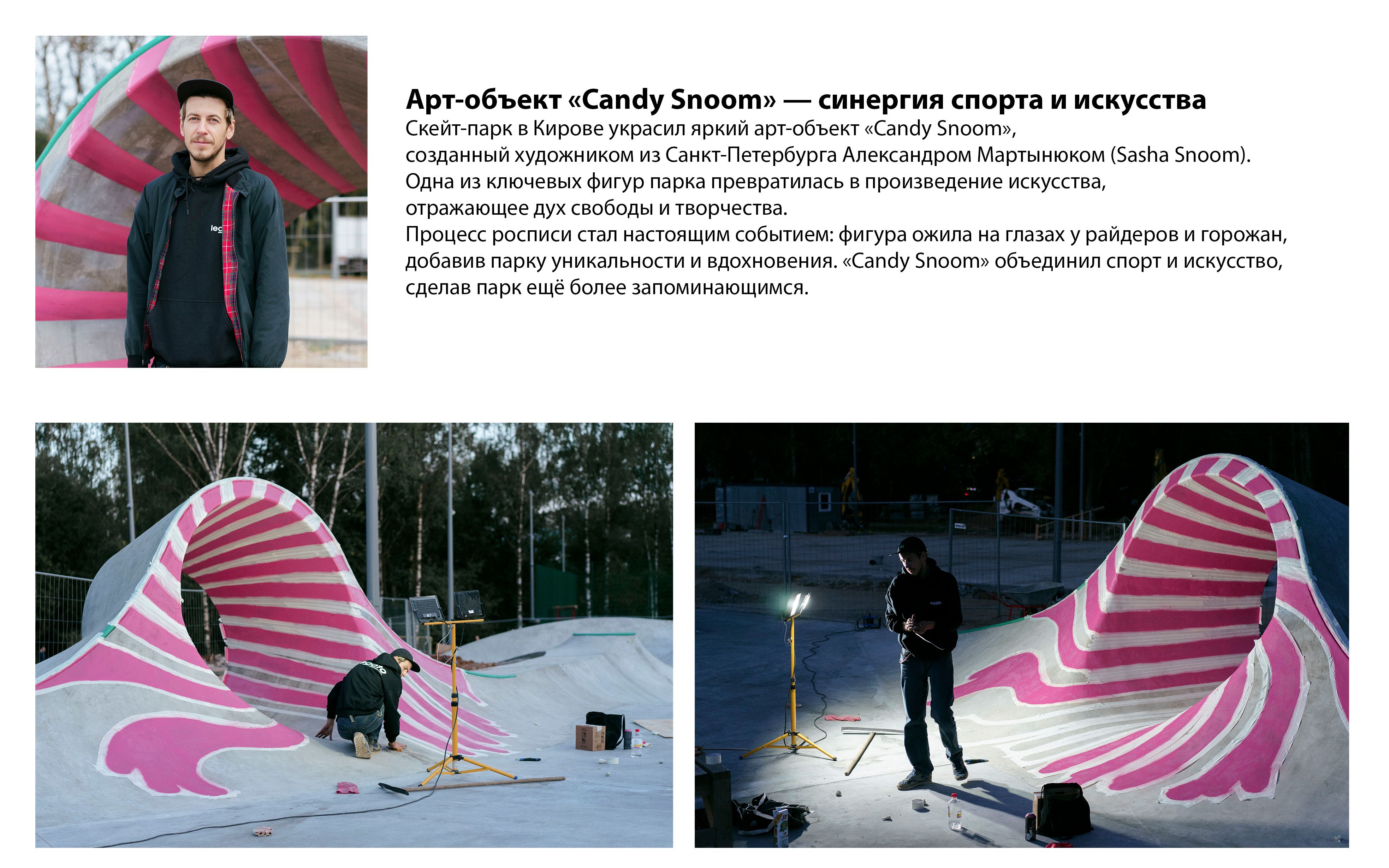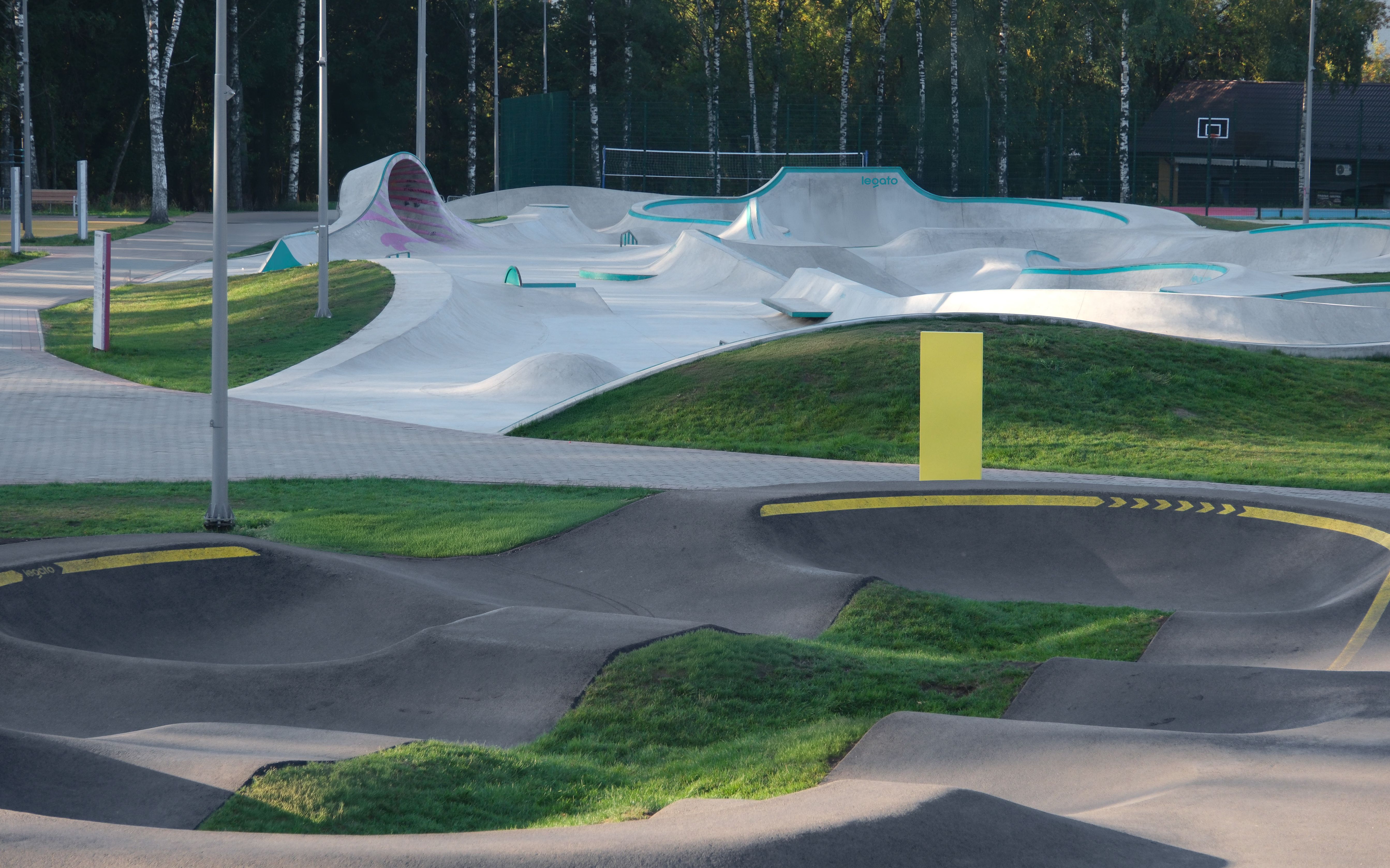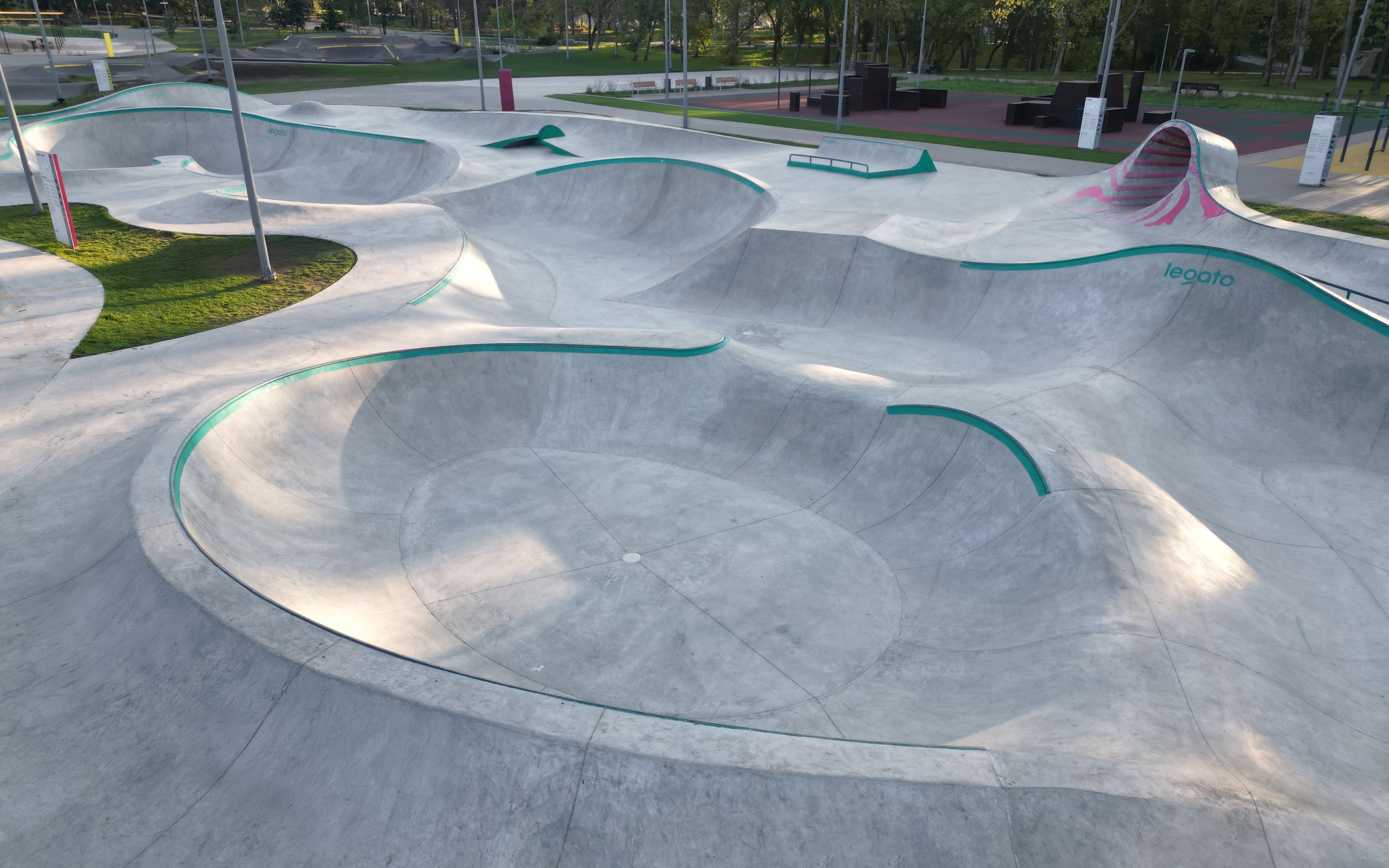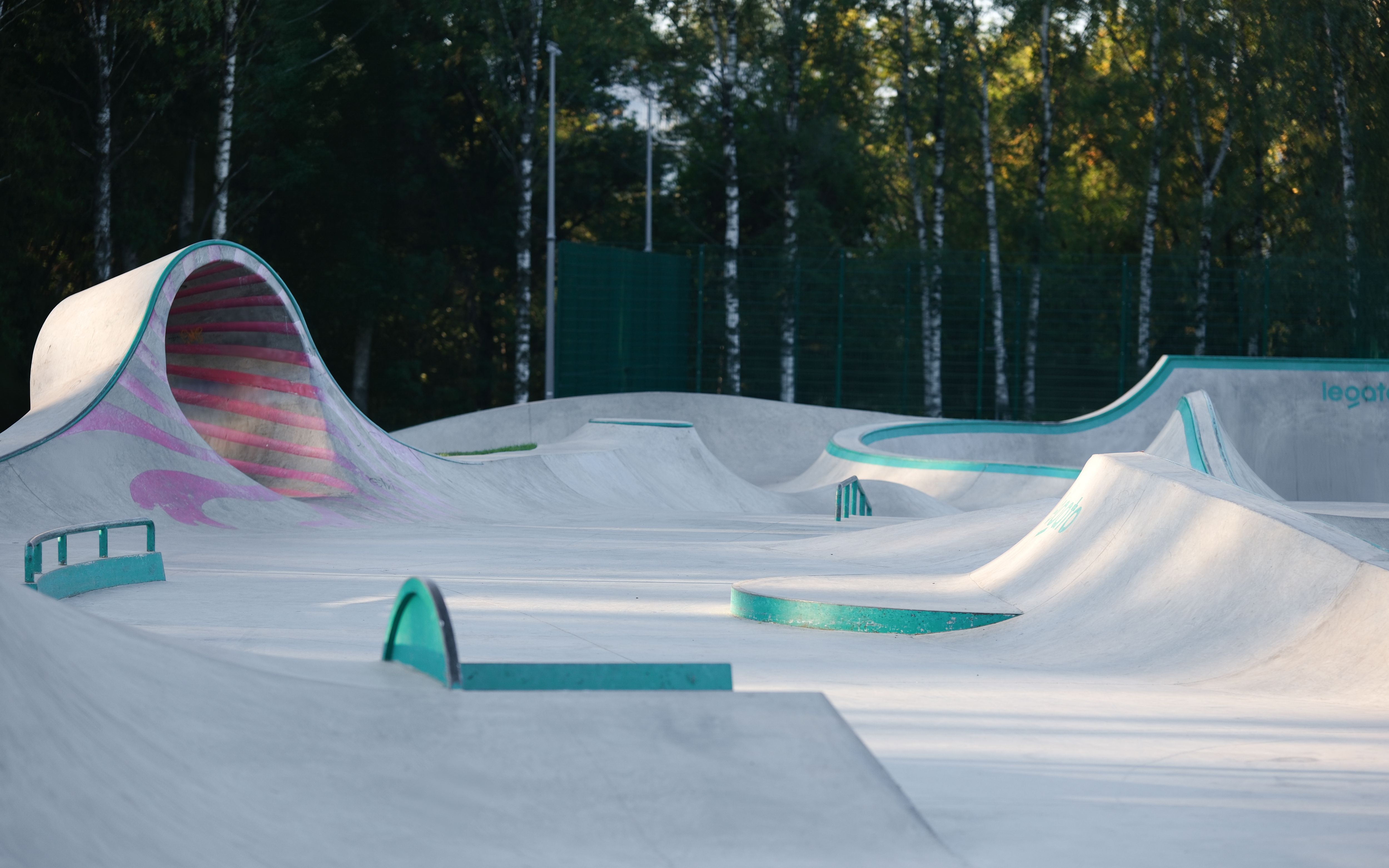 Скейт-парк площадью 1 850 м² включает боул и стрит-плазу, которые создают условия для выполнения сложных трюков и креативного катания. Важным акцентом этой зоны стал уникальный бетонный луп «Candy Snoom», разработанный и расписанный художником Александром Мартынюком (Snoom). Этот арт-объект не только служит входной аркой в скейт-парк, но и является символом творческой коллаборации Legato Construction с представителями современного искусства, подчёркивая важность самовыражения через архитектуру и дизайн.